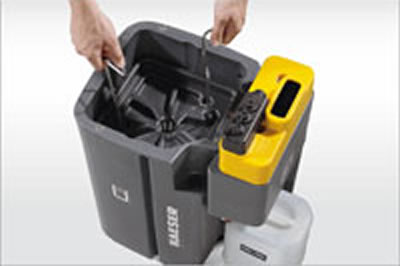 El cartucho del filtro principal se retira fácilmente mediante una práctica manija. Luego, el filtro se coloca, igualmente de forma sencilla, en la carcasa del AQUAMAT para el proceso de drenaje. El cambio del filtro es por consiguiente rápido y sencillo. Además, no es necesario pre-remojar el filtro nuevo que se ha de instalar.